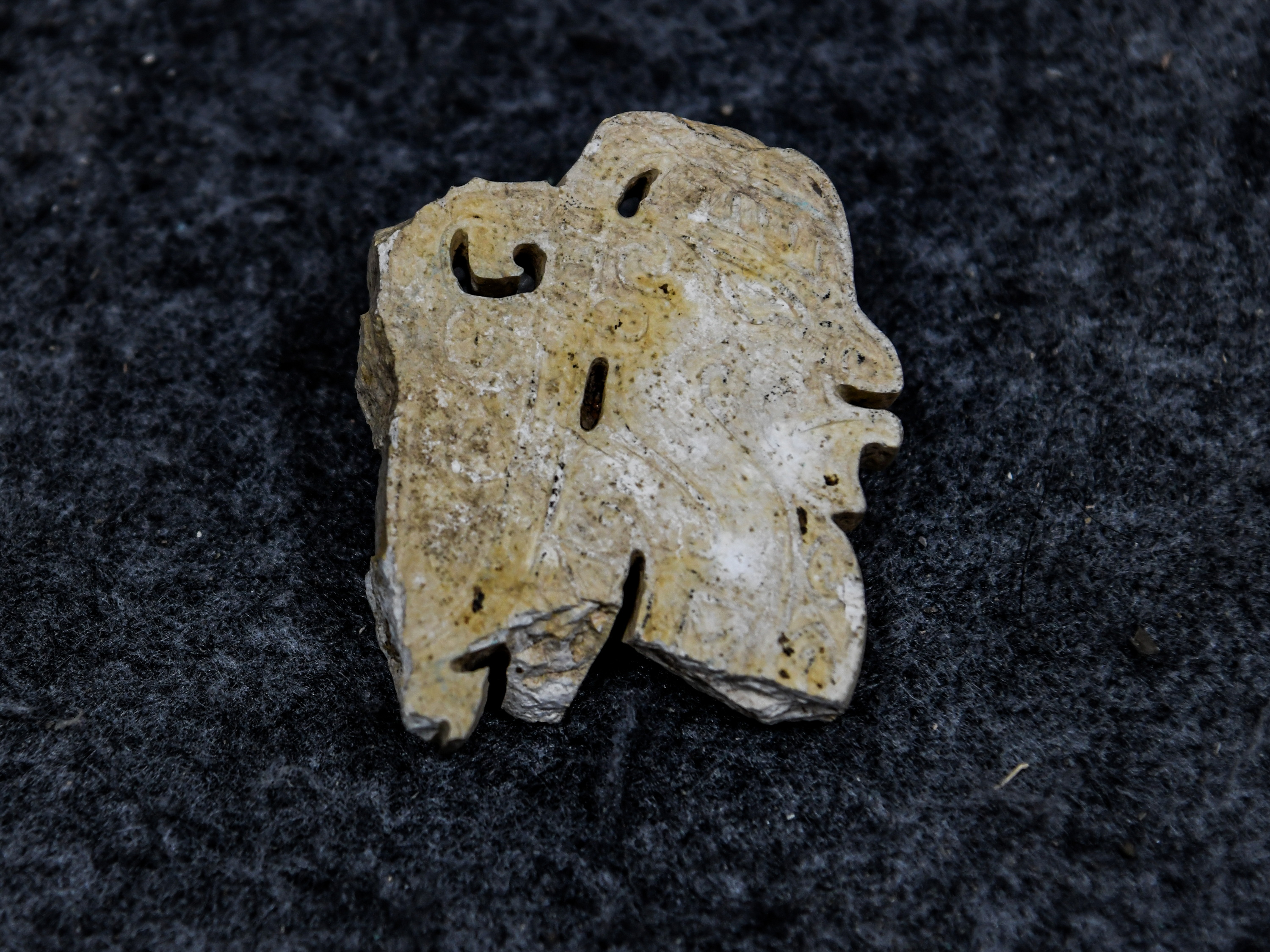 2023年12月5日拍摄的从四川资阳濛溪河遗址群出土的有X形划痕的骨器。该遗址是国际罕见的同时包含丰富石器、动物与植物遗存的“全科型”遗址,入选了“2024年度全国十大考古新发现”。