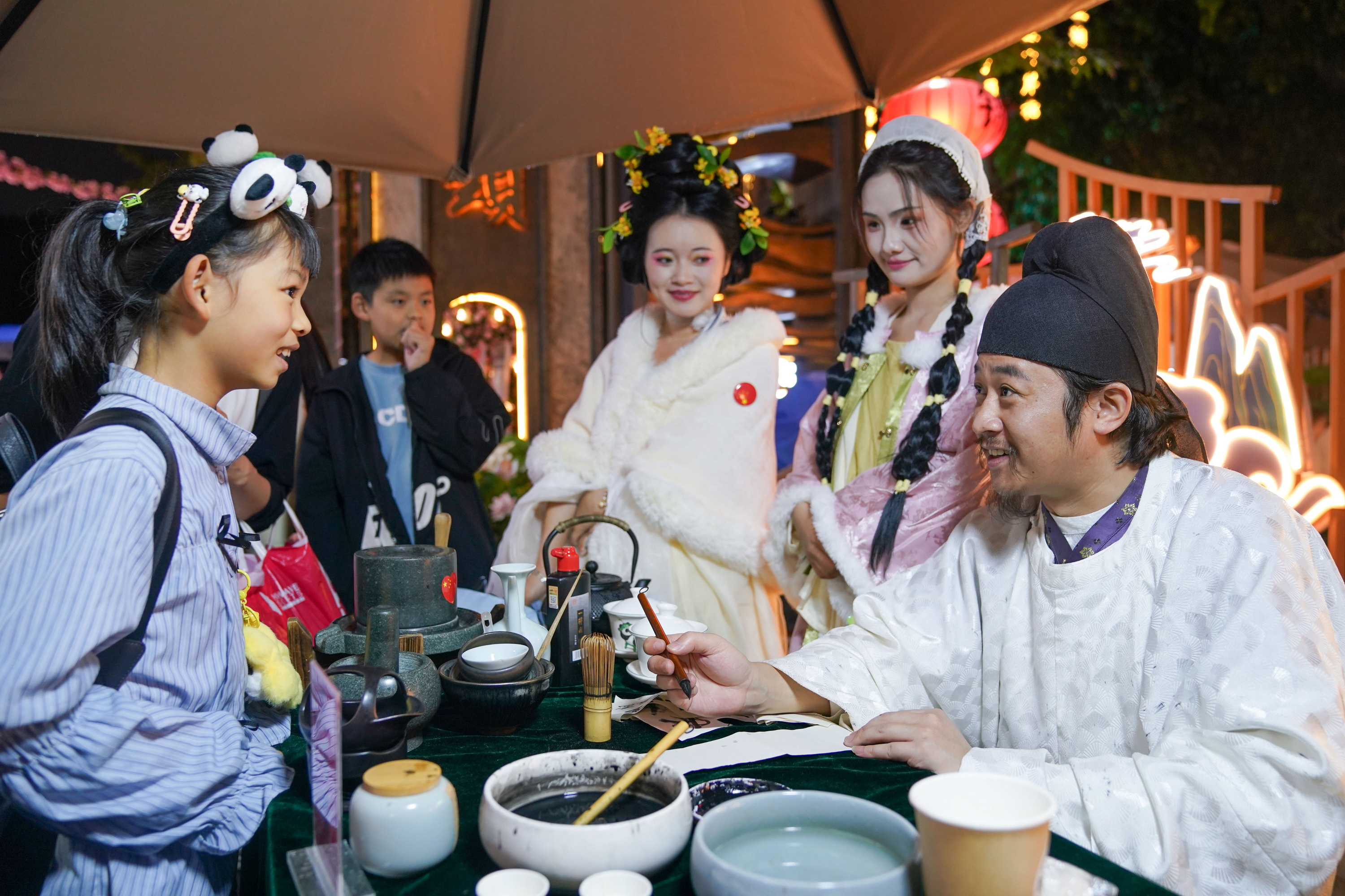 2024年10月4日,在四川省成都市东门码头夜游锦江项目推出的“锦夜庆华诞·璀璨耀蓉城”国庆系列主题活动上,“李白”(右)与小朋友互动对诗。