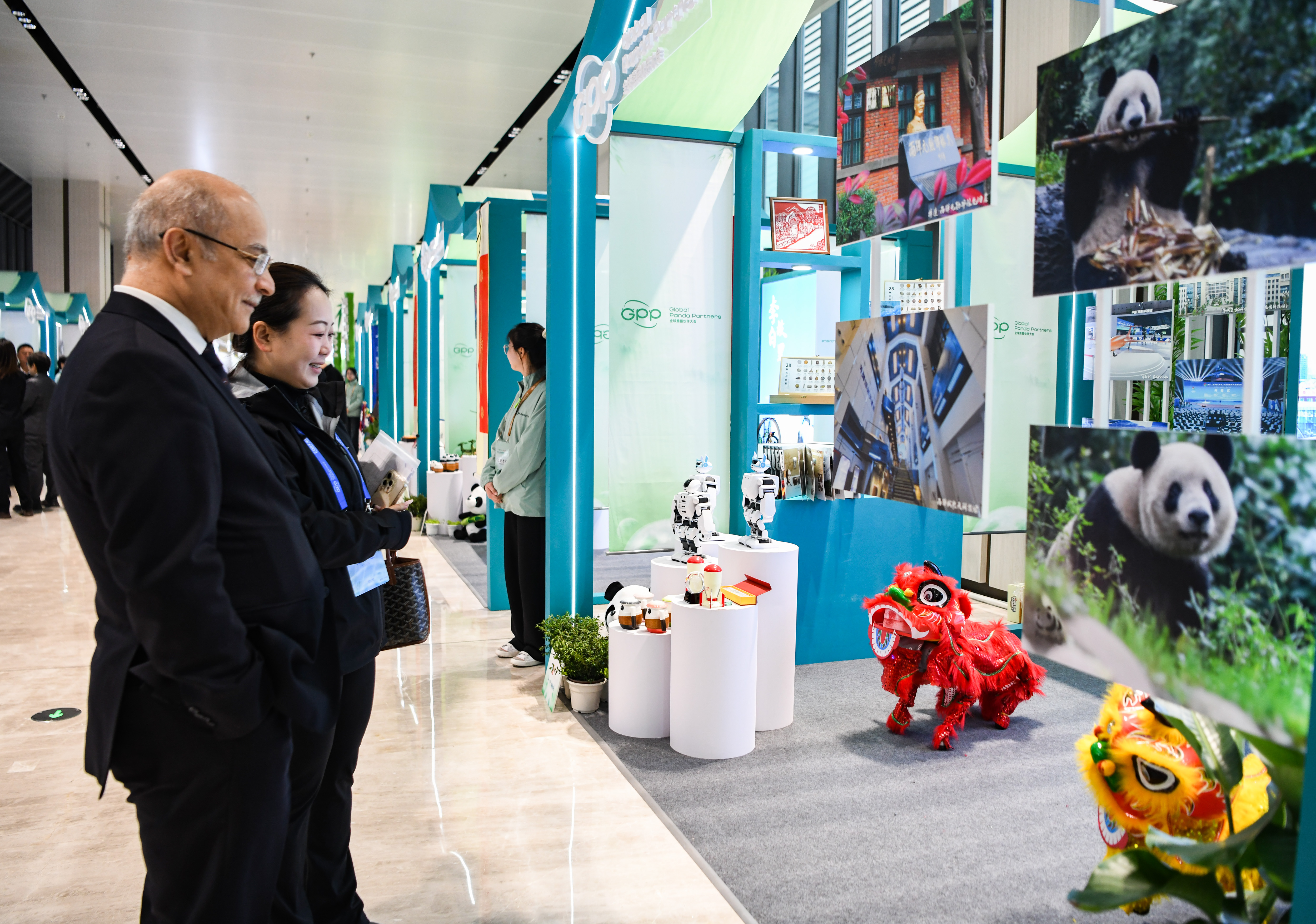 2024年11月26日,参会嘉宾在2024全球熊猫伙伴大会间隙观看舞狮机器人表演。