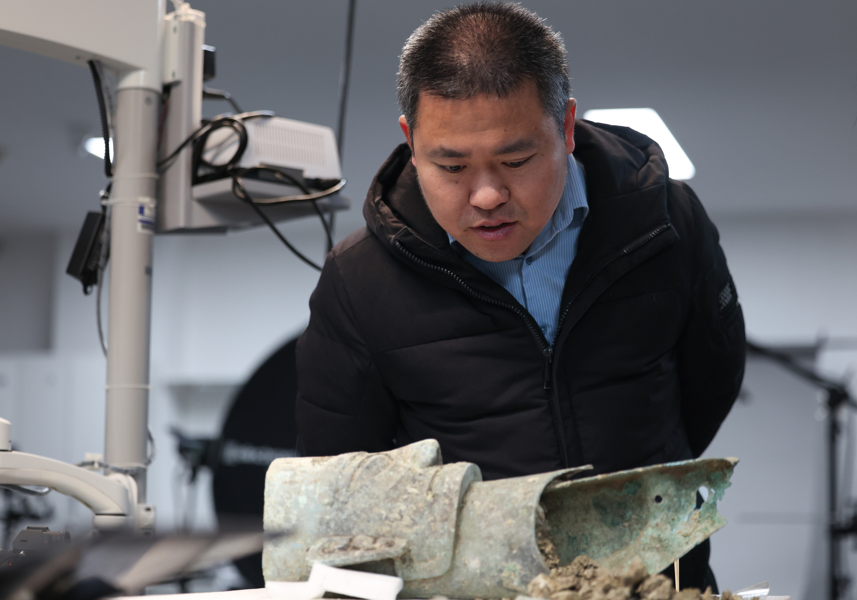 2024年12月16日,考古专家在三星堆研究院仔细查看一件青铜面具。当日,古蜀文明保护传承二期工程在三星堆研究院启动。