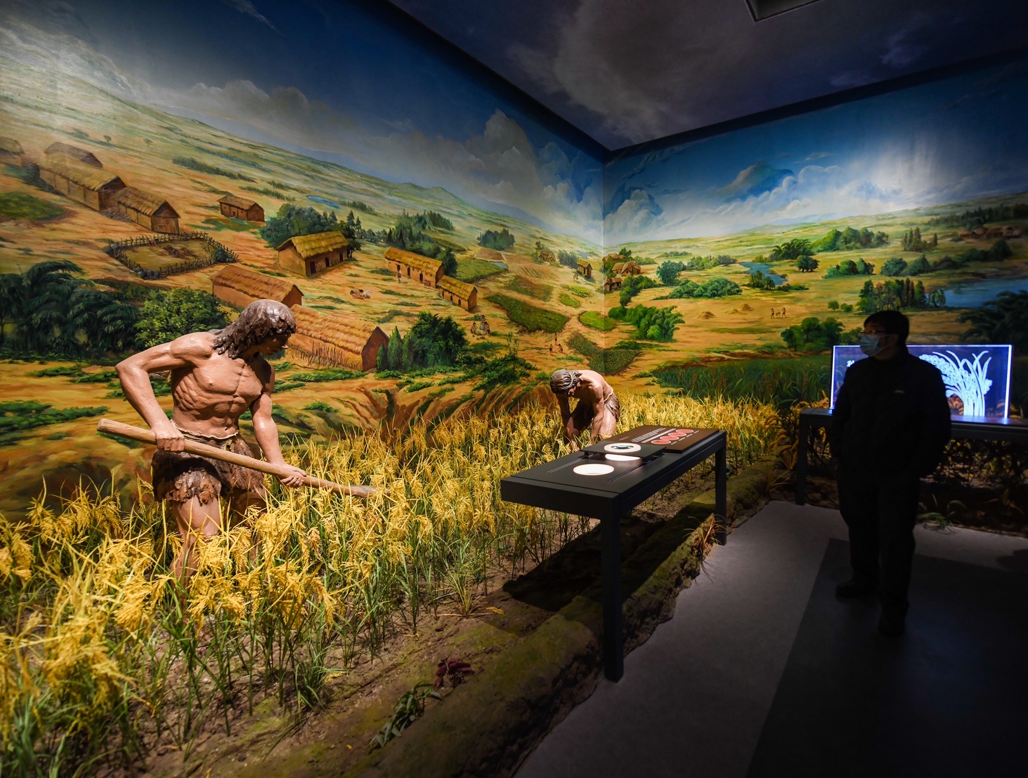 2022年1月21日,观众在成都市宝墩遗址展馆参观“宝墩遗址与宝墩文化展”。该展览讲述了宝墩文化时期,古蜀先民深入成都平原扎根繁衍、筑城而居、种植稻米等历史。