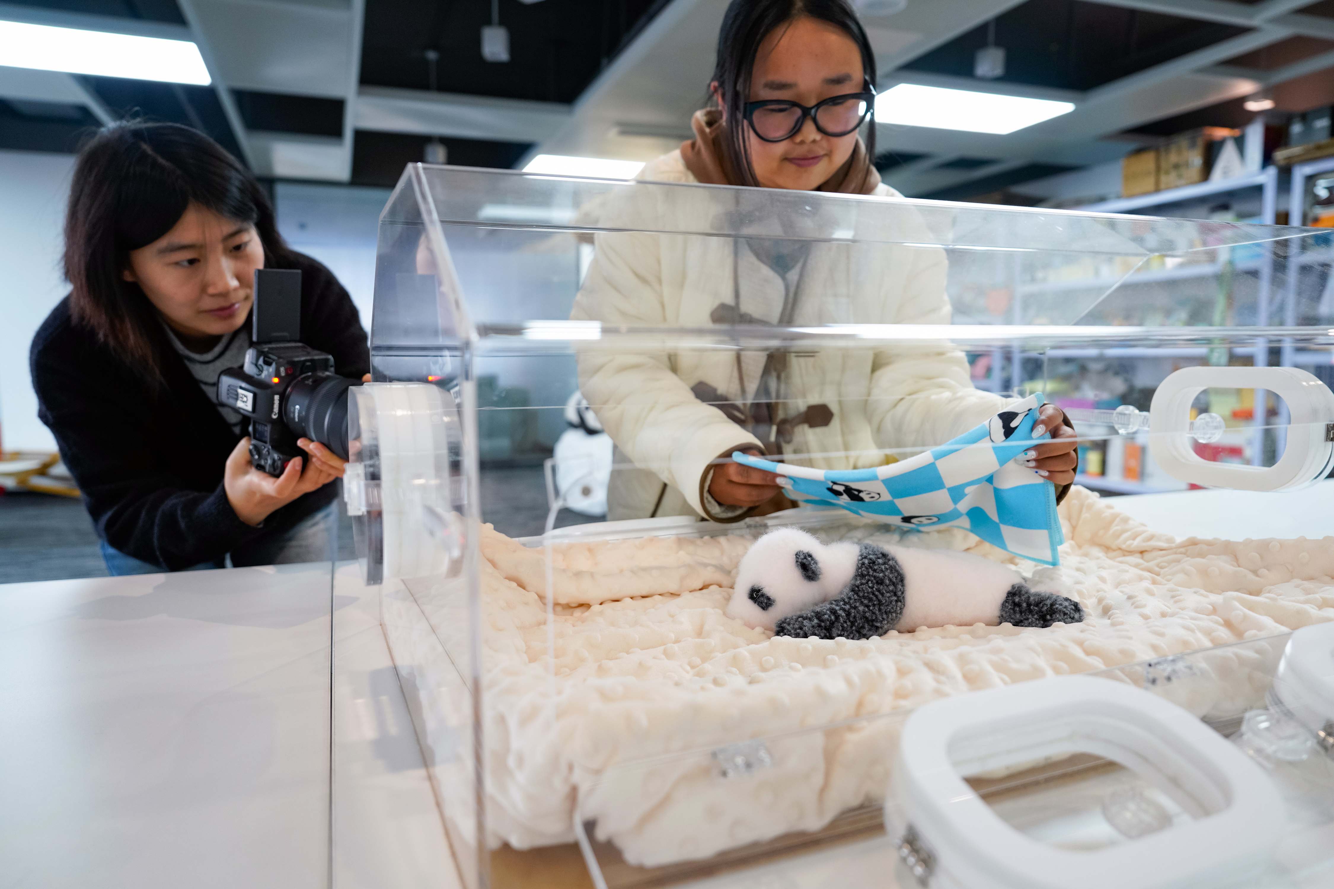 2024年11月20日,在位于四川省成都市的“熊猫工厂”总部,工作人员在为22日龄新生大熊猫幼崽高仿真玩偶产品拍摄短视频。依托我国传统非遗裘皮制作技艺,以不同年龄段的“和花”“萌兰”“香香”“福宝”等“网红”大熊猫为原型,运用3D建模等技术开发出高仿真、超仿真玩偶,当地企业已在全球50多个国家和地区累计销售超过5万只定制仿真大熊猫,也在短短几年内成长为年营收破千万元的企业。