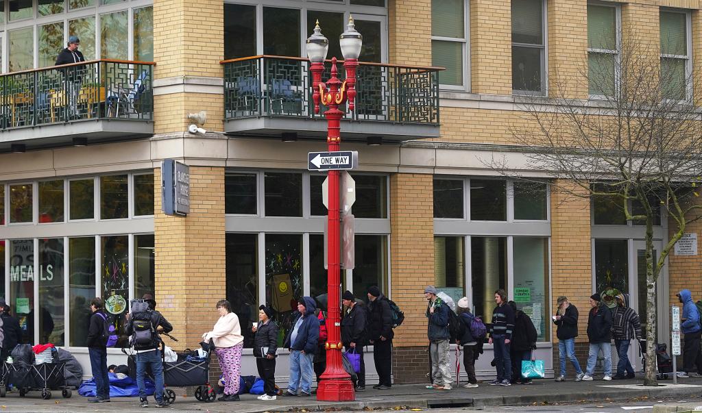11月4日,在美国俄勒冈州波特兰,等待领取免费食物的人们在街头排起长队。新华社记者吴晓凌摄
