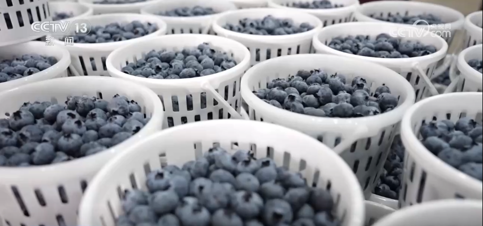 在当地一个基质蓝莓种植基地,一排排标准化暖棚内暖意融融。翠绿的枝叶间,一串串饱满圆润的蓝莓裹着白霜,长势喜人。种植户们分工协作,采摘、分拣、装箱、冷链打包一气呵成,新鲜蓝莓就通过冷链物流发往全国各大城市。