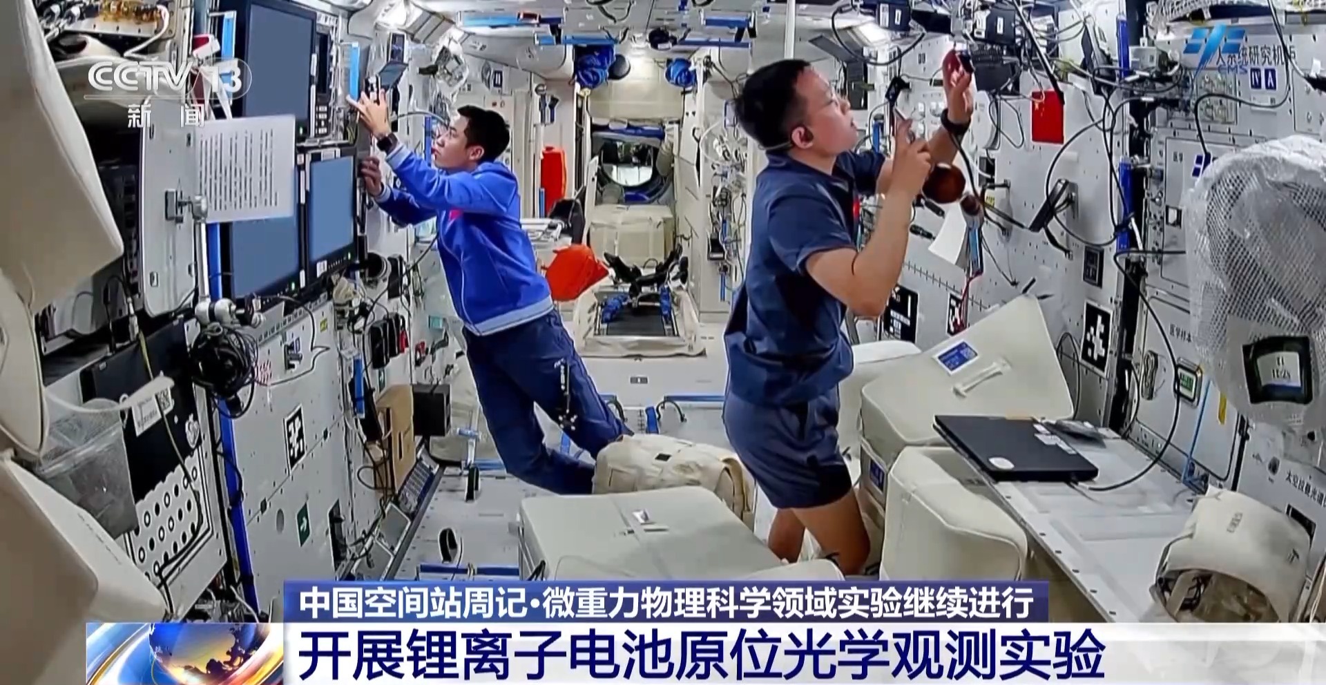 在微重力物理科学领域,乘组根据实验安排,完成了流体物理实验柜中复杂流体实验模块拆装,并更换了实验样品;乘组更换了燃烧科学实验柜内气体实验插件采样盖;乘组还进行了无容器柜实验腔体样品清理与更换、轴心机构电极维护等工作。