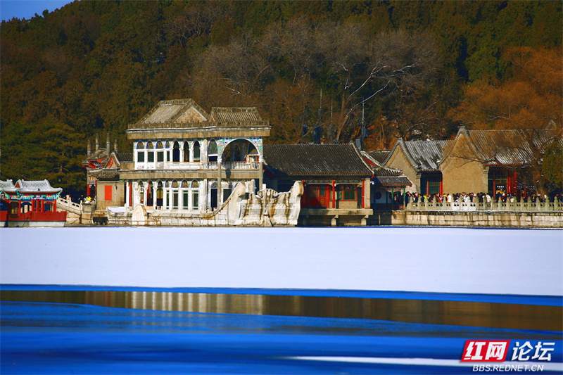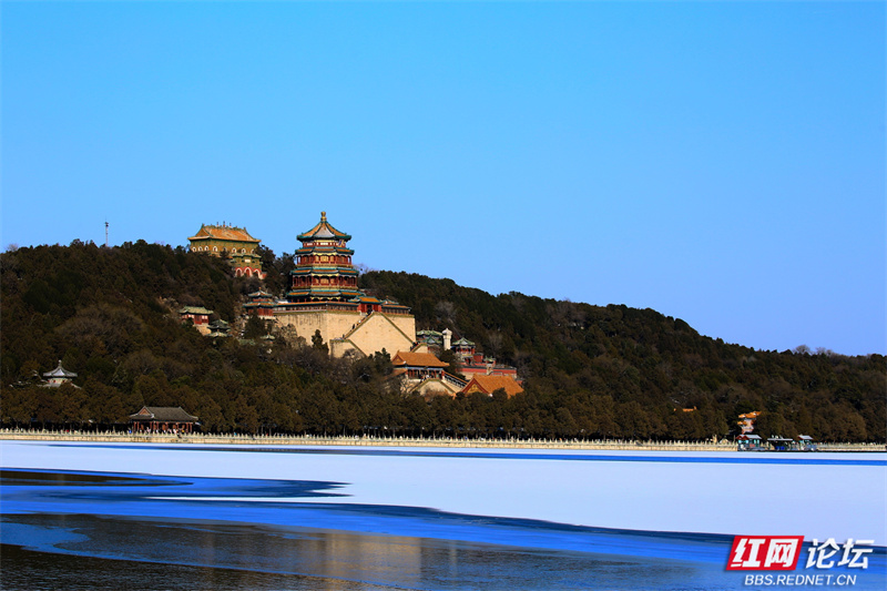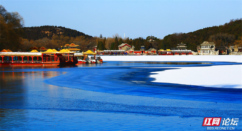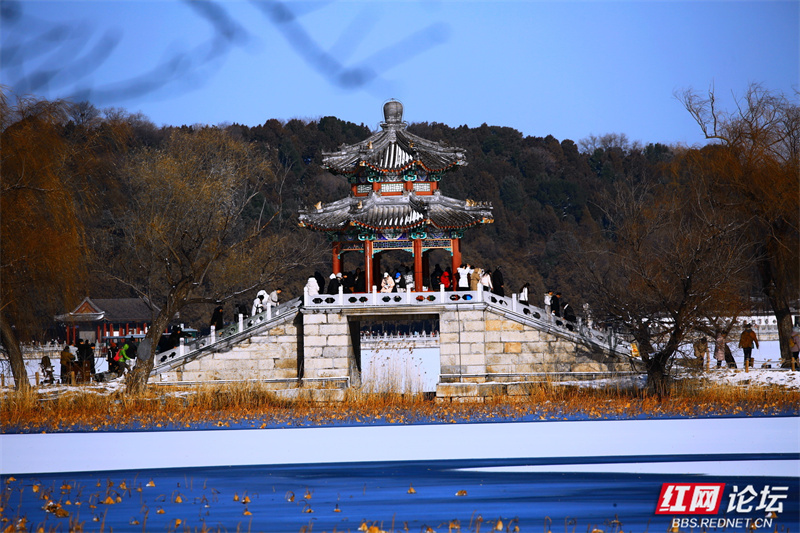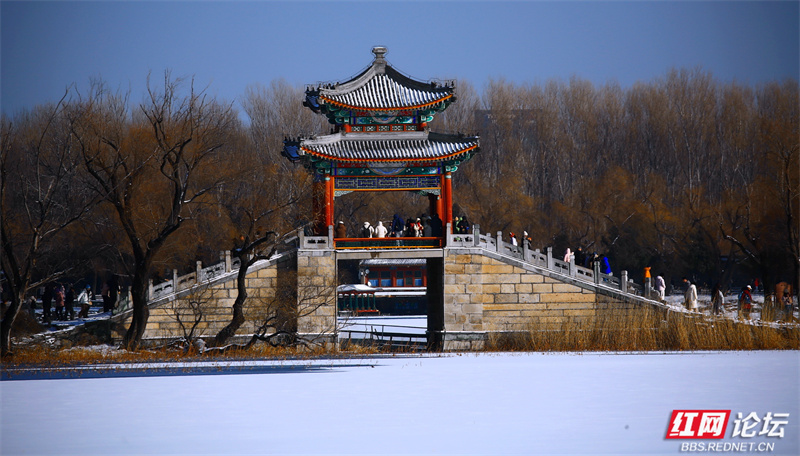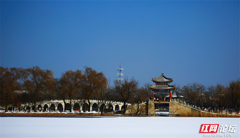 雪让这里慢了下来,也让美变得清晰。长廊少了往日的喧腾,树枝的线条在蓝天下舒展成简练的画。虽然未能走近,但镜头却为我留住了这份恰到好处的距离——一个完整的、宁静的、银装素裹的颐和园(图文/益阳洪源)