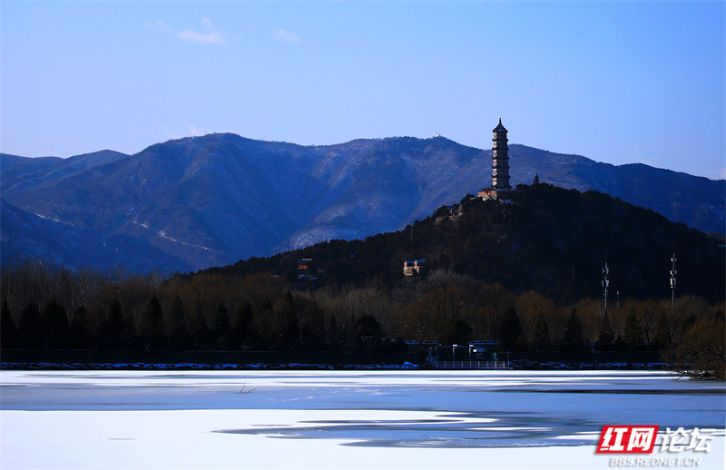 踩着未化的积雪走进颐和园,我收住了登上玉带桥的脚步——桥面的冰釉泛着光,上下的人都紧握着栏杆。也好,那就安心做个远处的观察者。长焦镜头成了另一双眼睛,替我掠过结冰的湖面,去触摸雪中园林的静美。