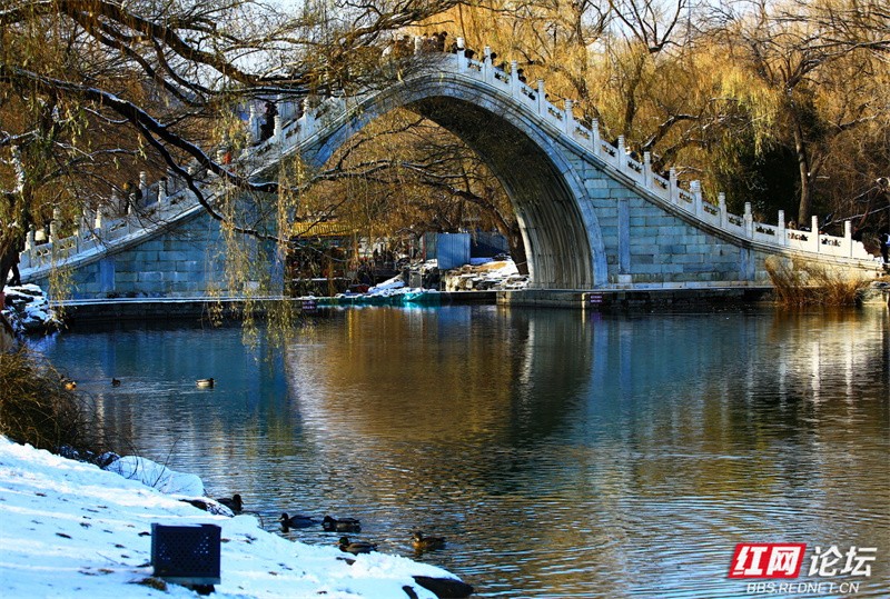 它带我看见:玉带桥优美的弧线静卧在雪毯之上,宛如一弯凝固的月;十七孔桥的倒影在未封冻的水中微微荡漾,与实桥连成一片静谧的韵律;佛香阁的红墙黄瓦被白雪衬得愈发庄重鲜明,仿佛时光在此停驻。游船静静地泊在岸边,朱红与明黄在蓝白色的世界里点缀出几分鲜活;远处山巅的宝塔与近处覆雪的古建遥相呼应,勾勒出皇家园林冬日的疏朗轮廓。