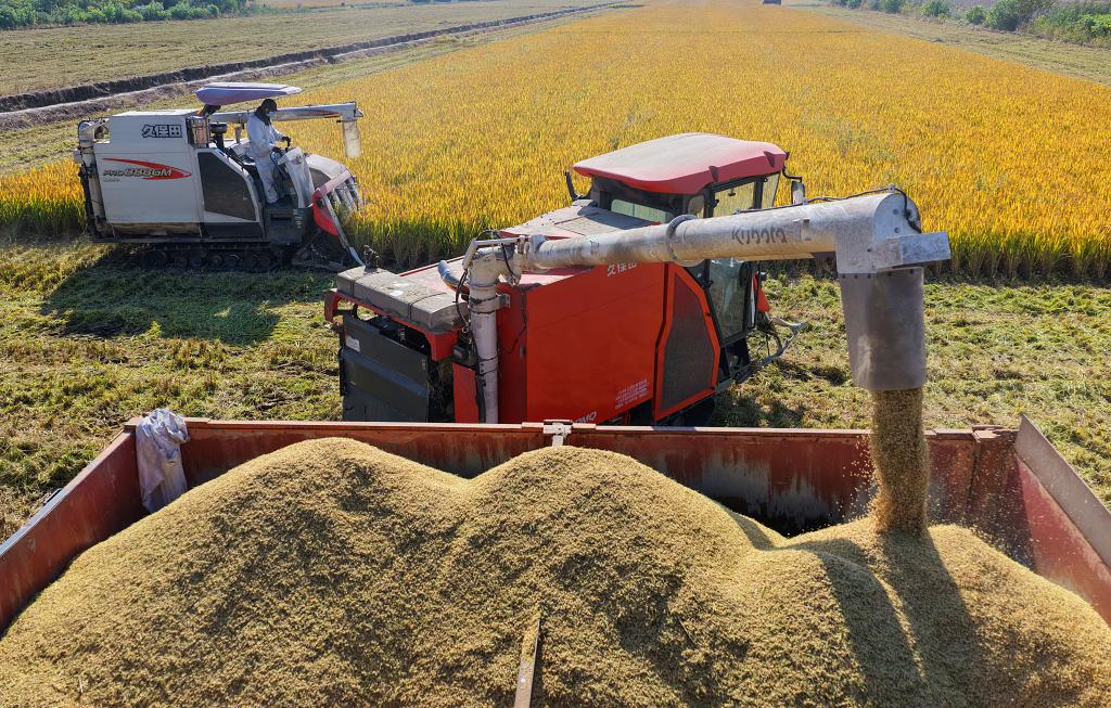 11月5日,江苏省农垦农业发展股份有限公司南通分公司收割机卸运刚刚收割的水稻(无人机照片)。