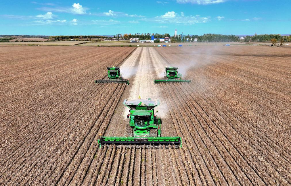 9月29日,在北大荒集团黑龙江尾山农场有限公司第一管理区,农机进行大豆收获作业(无人机照片)。