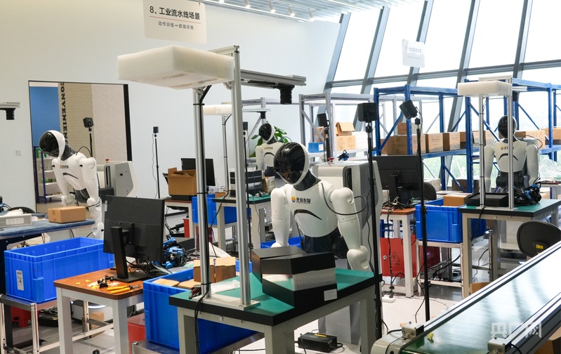 人形机器人在工业流水线场景中进行动作训练(央广网记者邓子依 摄)