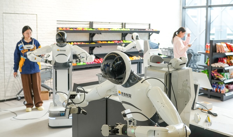 人形机器人在超市零售场景应用训练(央广网记者邓子依 摄)