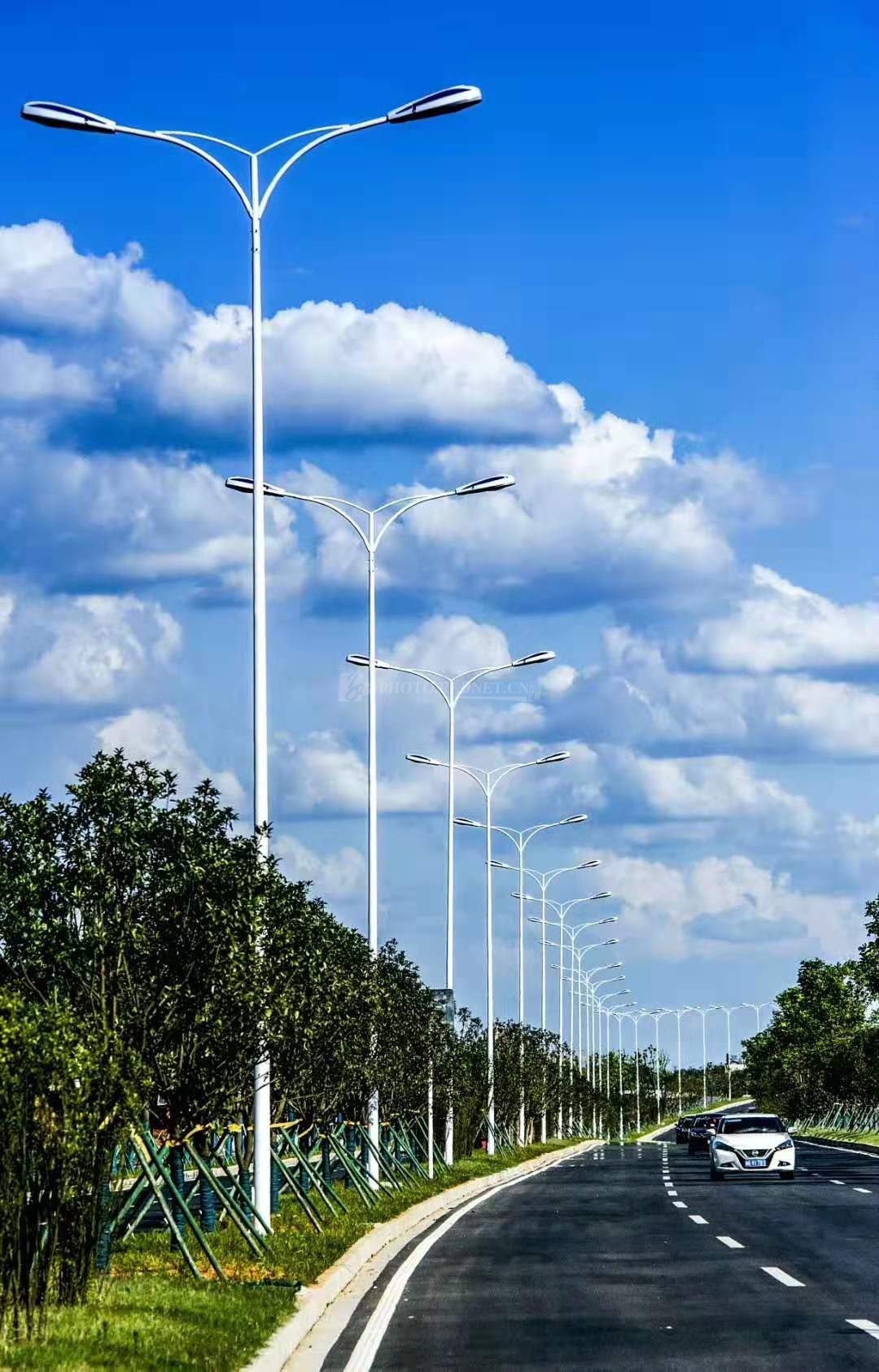白云整齐“躺”在路灯上。(图/卢七星)