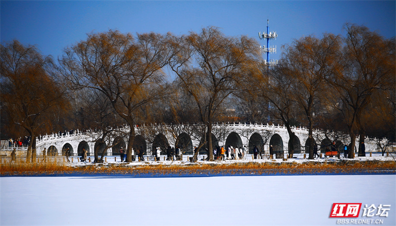 雪让这里慢了下来,也让美变得清晰。长廊少了往日的喧腾,树枝的线条在蓝天下舒展成简练的画。虽然未能走近,但镜头却为我留住了这份恰到好处的距离——一个完整的、宁静的、银装素裹的颐和园(图文/益阳洪源)
